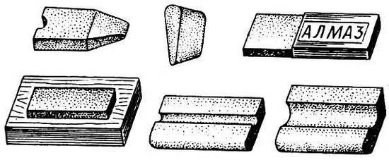 Тем, кто не имеет электроточила или предпочитает старый проверенный способ заточки абразивными брусками, необходимо приобрести небольшой их набор, включающий: брусок крупнозернистый для грубой обработки, мелкозернистый плоский, два-три с канавками и закругленными ребрами разного радиуса. Для доводки понадобятся оселки: плоский, два-три с канавками и закругленными ребрами (рис. 3.2), пригодится и мелкозернистый для правки опасных бритв. В последнем случае можно использовать также кожаный ремень с пастой ГОИ. Для радиусных поверхностей необходимы дощечки с канавками и палочки со шкуркой. Бывалые резчики применяют для доводки прелую липовую дощечку, смазанную пыльцой мелкозернистого оселка или полировочной пастой (ее желательно придавить, разглаживая наружной стороной полукруглой стамески). В магазине приобретите брусок с алмазным или корундовым покрытием. Для удобства и чтобы брусок не скользил по столу, вставьте его в деревянную колодку. В момент заточки и правки оселки смазывайте жидким машинным или подсолнечным маслом.