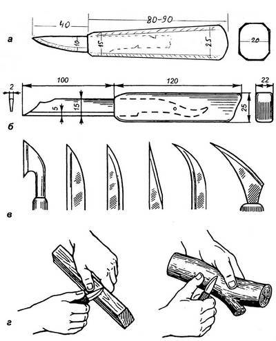 Итак, разберем разновидности режущего инструмента. К нему относятся ножи, косяки, плоские и полукруглые стамески, царазики, уголки, клюкарзы, ложкорезы, струги.