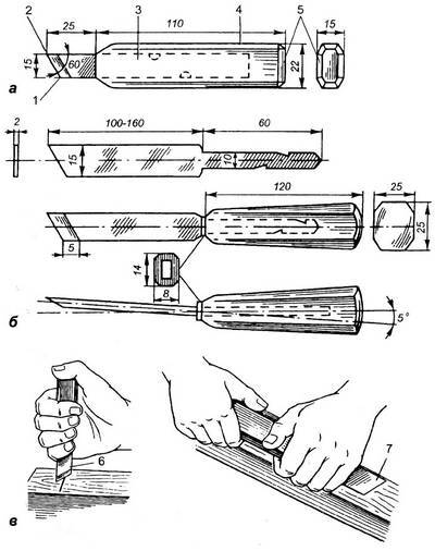 Рис. 3.4. Ножи-косяки: а – двусторонний (1 – пятка; 2 – носик; 3 – хвостовик; 4 – черенок-ручка; 5 – затылок); б – односторонний; в – способы их держания: 6 – двустороннего; 7 – одностороннего