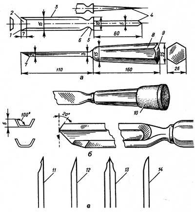 Рис. 3.5. Плоские стамески: а – без бортиков (1 – режущая кромка; 2 – фаска; 3 – полотно; 4 – хвостовик; 5 – упор; 6 – шейка; 7 – пятка; 8 – черенок ручка; 9 – затылок; 10 – резиновая насадка); б – с бортиком; в – способы заточки (11–13 – правильные: 11 – двойная фаска; 12 – одинарная фаска, 13 – двухсторонняя фаска; 14 – неправильный)