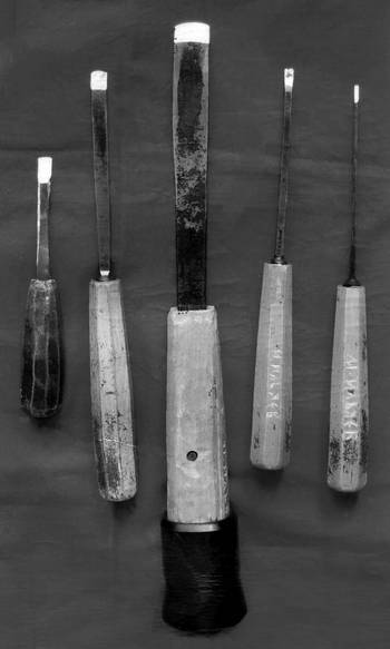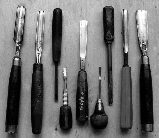 Советую использовать штихели для линолеума при работе с мягкими породами дерева. Хотя эти инструменты быстро тупятся из-за низкого качества стали, они имеют нужные формы режущего полотна и пригодны для контурной резьбы и вырезания орнаментов. Можно использовать и пришедшие в негодность хирургические инструменты. Они изготовлены из подходящей стали и по форме близки к требованиям резчика.