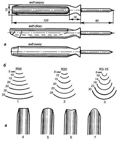Рис. 3.6. Полукруглая стамеска: а – конструкция; б – ширина и радиусы режущих кромок (1 – отлогие; 2 – средние; 3 – крутые); в – формы кромок (4 – прямая; 5 – радиусная; 6 – вогнутая; 7 – вытянутая)