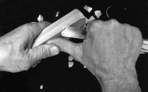 Большой палец также сверху, касается начала ручки. Внизу его держать нежелательно, так как он будет задевать заготовку в момент срезания. Левая рука, удерживая инструмент, сдерживает движение косяка вперед, чтобы не срезать лишнее. Одновременно, при необходимости, она нижней частью кисти у запястья (условно называю «пяткой»), упираясь в само изделие, придерживает его.