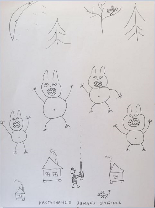 И так зайцам стало страшно, что лапы подкосились, они опустились на все четыре конечности, прижали уши и бросились назад в лес, давя друг друга, не разбирая дороги.