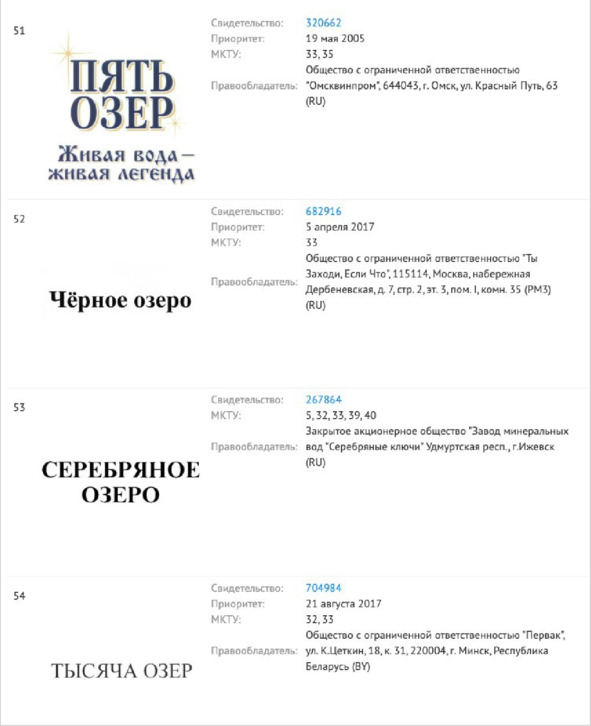 Производители водки очень любят слово «озеро». Я насчитал 42 подобных товарных знака, еще 17 заявок получили отказ. Трюк не сработает, если название выдуманное: у них слишком сильная различительная способность. «Кристальное озеро» и «Белое озеро» различаются, «Яндекс» и «Кристальный яндекс» – нет