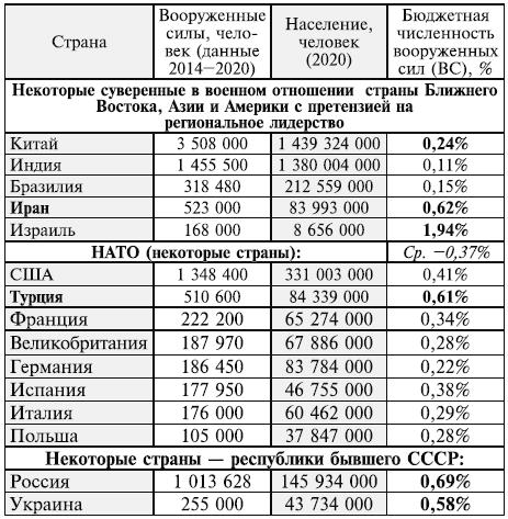 Безусловно, гипервоенной державой является государство Израиль, противостоящее почти всему арабскому миру. Отсюда и самый высокий показатель бюджетной численности ВС вообще.