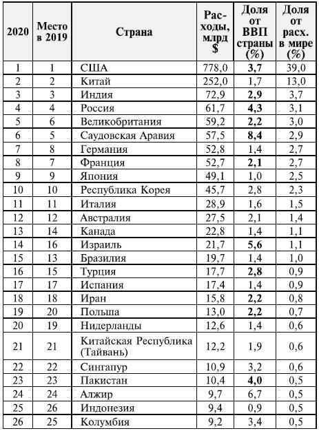 В 2020 году военные расходы в мире превысили $1,98 трлн., что на 2,6% выше показателей предыдущего года, сообщал в 2021 году Стокгольмский международный институт исследований проблем мира (SIPRI). В пятерку лидеров по тратам вошли США, Китай, Индия, Россия и Великобритания, на них пришлось 62% всех мировых военных расходов21.
