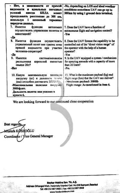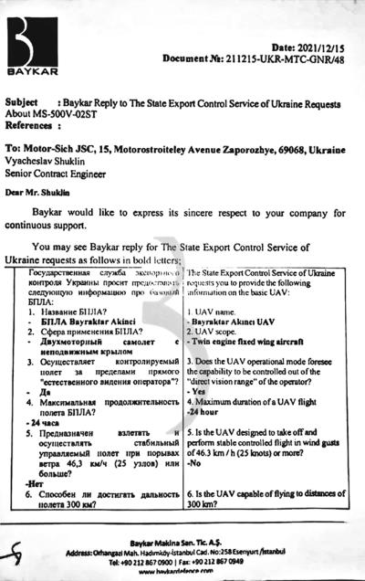 Baykar Reply to Vie State Export Control Service of Ukraine Requests About MS-500V-02ST/ «Вайкар Ответ на Запросы Государственной службы экспортного контроля Украины о БПЛА MS-500V-02ST», от 1.12.2021 г.