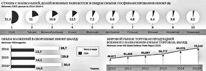 Страны с наибольшей долей военных разработок в общем объеме госфинансирования НИОКР (2014-2016)