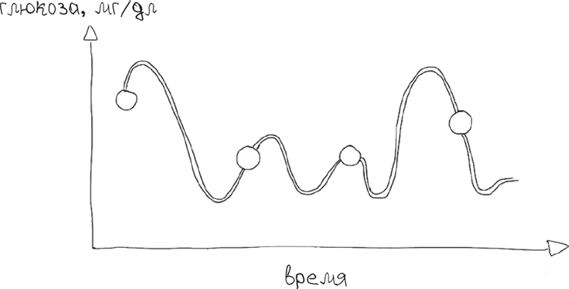 Я принялась проверять уровень глюкозы в самых разных ситуациях. Делала это, когда чувствовала себя прекрасно и когда чувствовала себя ужасно. Во время физических упражнений, утром после пробуждения и вечером перед сном. Мое тело разговаривало со мной на языке подъемов и спадов глюкозы.