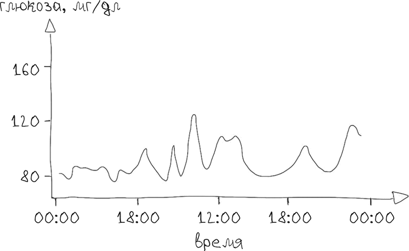 Все стало еще интереснее, когда я попробовала сопоставить уровень глюкозы с ментальным состоянием. Спутанность сознания (которую я начала испытывать после несчастного случая) часто коррелировала с сильным скачком, а сонливость – с резким спадом уровня сахара крови. Неодолимая тяга к конкретным продуктам вызывала то, что я называю американскими горками глюкозы, а именно стремительное чередование ее скачков и спадов. Если утром я едва могла сползти с постели, значит, у меня всю ночь уровень сахара крови был повышен.