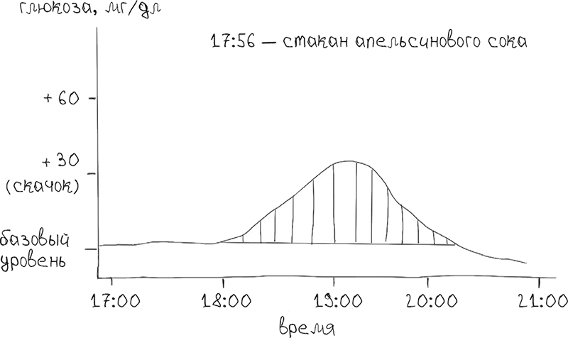 Я начала вести журнал питания и фиксировать в нем все, что ела. Каждая запись (например, «17:56 – стакан апельсинового сока») иллюстрировалась показателями на четырехчасовом отрезке времени, начиная за час до того, как я выпила сок, и заканчивая тремя часами после этого. Такой подход позволял получить достаточно полное представление о том, какими были мои уровни глюкозы перед едой, во время еды и после нее.