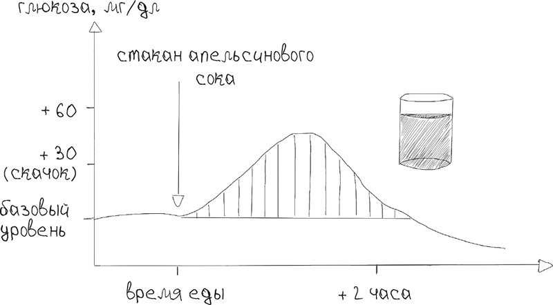Диаграмма, созданная с помощью моей самодельной программы. Апельсиновый сок и все другие фруктовые соки не содержат клетчатки, зато в них много сахара. Их употребление приводит к скачку глюкозы