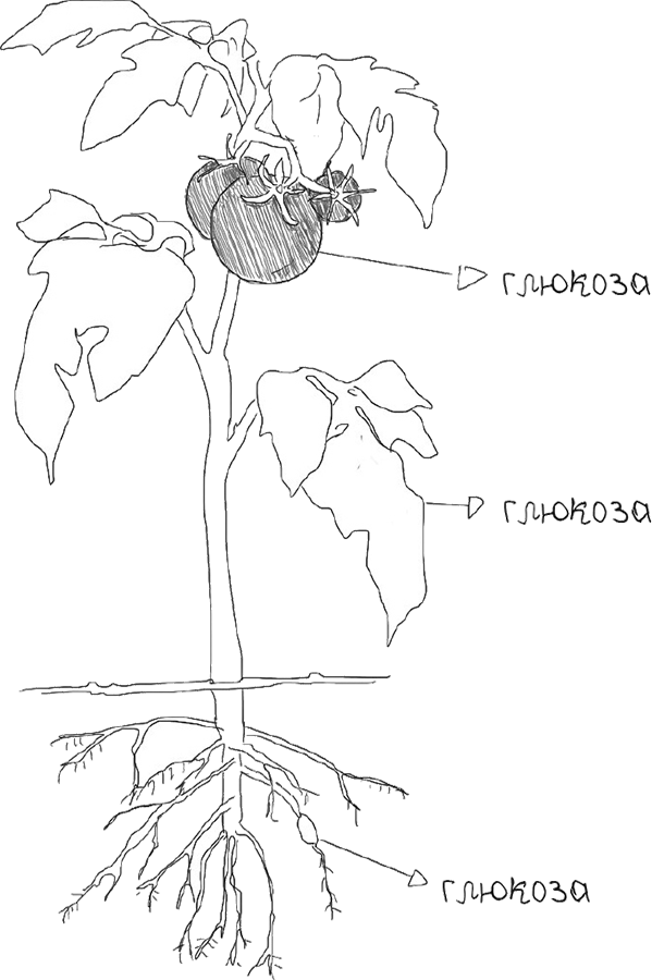 Растения могут либо расщеплять глюкозу, чтобы использовать ее как источник энергии, либо сохранять ее молекулы в нетронутом виде, как строительные кирпичики. Чтобы дать вам представление об их размере, скажу лишь, что в точке на конце этого предложения могло бы разместиться 500 тысяч молекул глюкозы. Ее можно использовать для формирования жесткого ствола растения, гибких листьев, тонких корней или сочных плодов. Точно так же, как из одного и того же химического элемента (углерода) могут быть созданы алмаз и карандашный грифель, растения могут производить из глюкозы множество разных вещей.