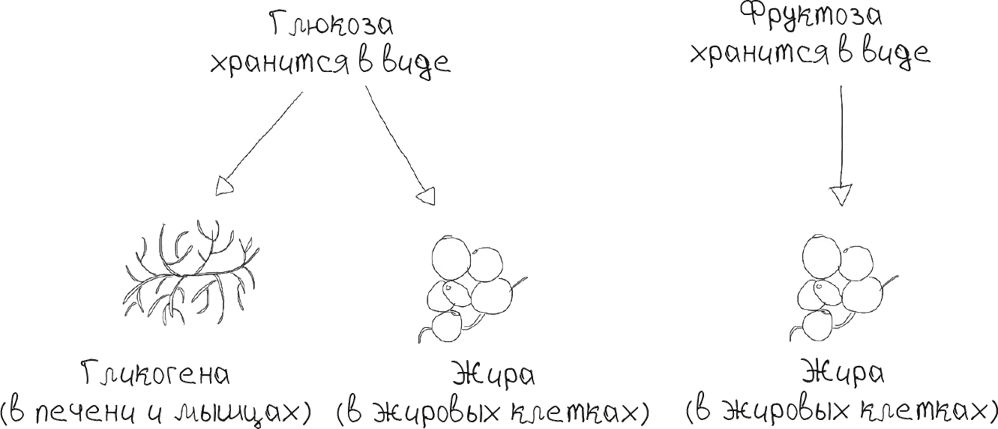 У людей лишняя глюкоза хранится в виде гликогена и жира. Лишняя фруктоза просто преобразуется в жир