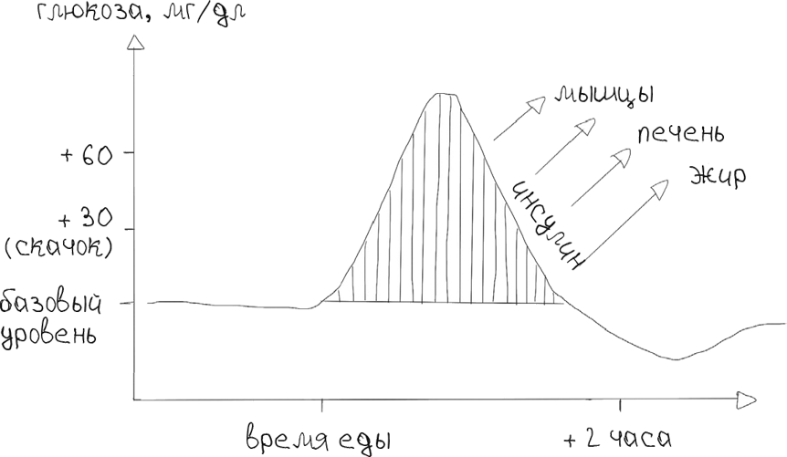 Это возвращает нас к вопросу о значимости инсулина. Как я уже объясняла, он помогает прятать избыток глюкозы в трех хранилищах. И в краткосрочной перспективе это полезно. Но чем больше скачков глюкозы мы испытываем, тем больше инсулина вбрасывается в наш кровоток. В долгосрочной перспективе хроническое повышение уровня инсулина само по себе создает немало проблем. Переизбыток инсулина становится основной причиной ожирения, диабета 2-го типа, СПКЯ и многих других недугов. Вот почему одним из самых важных позитивных последствий сглаживания наших кривых глюкозы становится автоматическое выравнивание кривых инсулина.