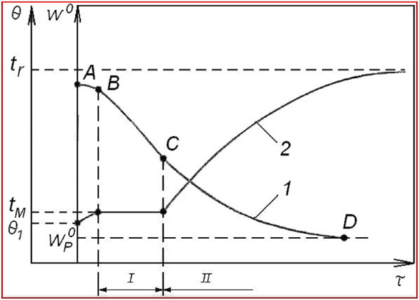На рис 1. показано изменение влажности (1) и температуры (2) тела при сушке. Чаще всего в начальный момент температура всех точек тела одинакова и равна начальной температуре материала θ1. Если температура газовой фазы равна tг, то именно к этому значению стремится средняя температура высушиваемого материала θ.
