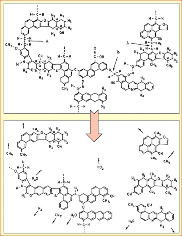 Рис 2. Гипотетическая структура угля (вверху). Связи (А) с малой энергией разрыва. Термическое разрушение гипотетической молекулы угля (внизу)