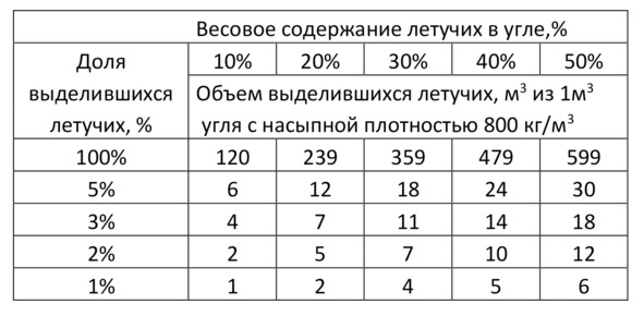 Таблица 1. Объем выделившихся горючих газов из 1м3 мелкого угля с насыпной плотностью 800 кг/м3