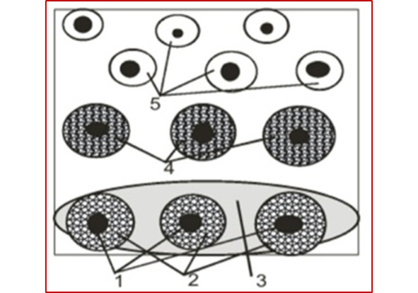 Рис 4. Механизм распространения горения во взвешенной угольной пыли [4]: 1 – частицы пыли вблизи источника воспламенения; 2 – скопления горючих выделившихся газов; 3 – источник воспламенения; 4 – оболочки горючих газов воспламеняемые тепловым излучением; 5 – формируемые скопления горючих газов вокруг нагреваемых пылинок