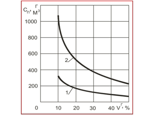 Рис 5. Результаты [4] теоретического расчета взрывчатой концентрации угольной пыли от выхода летучих: 1- Нижний концентрационный предел взрываемости. 2 – Верхний концентрационный предел взрываемости