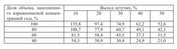 Таблица 3. Теоретический нижний концентрационный предел взрываемости угольной пыли (г/м3) в зависимости от выхода летучих и доли объема, заполненного взрывоопасной концентрацией выделившихся газов [4]