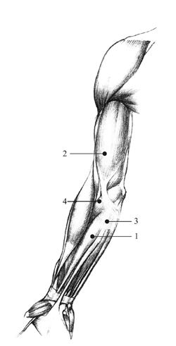 Рис. 2. Строение мышцы: 1 – начало мышцы, 2 – брюшко мышцы, 3 – сухожилие и прикрепление, 4 – прикрепление