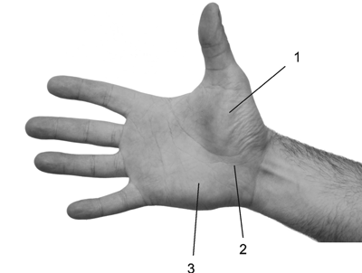 Рис. 3. Ладонная поверхность кисти: 1 – тенар; 2 – основание ладони; 3 – гипотенар