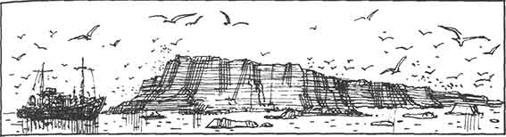 Сперва идем к Белл-Айлу, одинокому островку в устье одноименного пролива. Он лежит примерно в четырнадцати морских милях к северу от Ланс-о-Мидоуза. Южный и западный берега показались нам не очень приветливыми – в море обрывались крутые скалы. Плоскогорье высотой до двухсот пятидесяти метров тоже выглядело безотрадным. Не видно было ни одной гавани, кругом плавали айсберги. В старину рыбаки называли остров Белл-Айл островом Демона; их вполне можно понять. Зато он отличный ориентир, и для винландцев тоже, наверно, был таким.