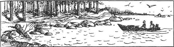 В залив впадает река Парадайз, между тальником, елью и лиственными заманчиво блестят длинные плёсы. Мы бросили якорь, не доходя до устья. К «Халтену» приблизилась лодка, в которой сидел стройный седобородый человек с трубкой в зубах. С ним было двое детей. Мы пригласили его на борт, предложили выпить кофе и рюмочку водки. Наш гость рассказал, что добывает пушнину и ловит лосося, домик его стоит поблизости. Анна Стина, очарованная детишками, заметила: