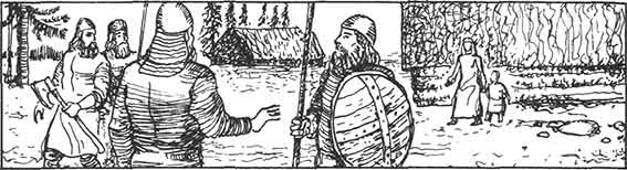 Кончился день,Вечер пришел,В землю огонь зарываю,Дай бог, чтоб онНикогда не потух.С моря дует свежий ветер, но небо чистое, и вечернее солнце озаряет равнину мягким светом. Видимость отличная. Море, острова, на севере из волн сказочным дворцом вздымается скалистый Белл-Айл, а еще дальше голубеют берега Лабрадора, вдоль которых винландцы шли на юг.