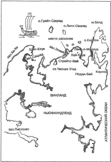 В «Саге о гренландцах» читаем, что Лейв отказался отдать Торфинну Карлсефни и Фрёйдис свои дома в Винланде и разрешил только пользоваться ими. Очевидно, дома представляли для него какую-то ценность, и он считал, что без особого труда сможет их отыскать. Здесь, как и во многих других случаях, действительность подтверждает достоверность саги. Маршрут в самом деле очень прост, я уже указывал: пройдя через Девисов пролив, винландцы должны были только не терять из виду землю на западе. И сперва идти вдоль побережья Баффиновой Земли с прилегающими островами, потом плыть на юг мимо берегов Лабрадора, пока прямо по курсу не возникал Ньюфаундленд. Тут безошибочным ориентиром служил Сакред-Айленд, а сразу за ним лежал Ланс-о-Мидоуз. Только и всего. Сидя в своем доме в Гренландии, Лейв Эрикссон мог так же немногословно, как это сделано в саге, дать вполне надежное навигационное описание.