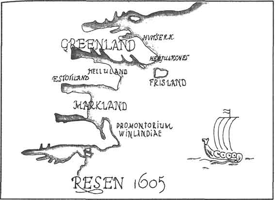 Карта Ханса Поульсена Резена начерчена в 1605 году. И на ней мы видим длинный мыс с надписью: Промонториум Винландиа. Карта Резена родственна Сколхолтской, но не может быть ее копией – в латинском тексте на ней ясно сказано, что в ее основе лежит карта, которая на несколько сотен лет старше. Возможно, у обеих карт был общий источник.