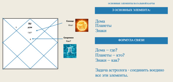 Натальная карта состоит из трех основных элементов: дома (где?), планеты (кто?), знаки (как?).