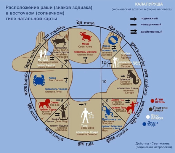 На рисунке 3 изображен вселенский человек Калапуруша. И здесь отчетливо видно, что первому дому гороскопа соответствует голова вселенского человека, второму – рот, третьему – руки и т. д.