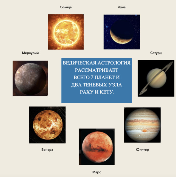 А теперь познакомимся с главными действующими лицами, то есть планетами. Всего ведическая астрология использует семь планет: Солнце, Луну, Венеру, Юпитер, Сатурн, Меркурий, Марс, а также лунные узлы Раху и Кету.