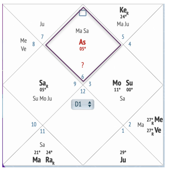 На примере мы видим, что в первом доме (он выделен квадратом) стоит цифра 6. Это значит, что перед нами Восходящая Дева. И Лагна находится в 5 градусах Девы. Всего каждому дому соответствует 30 градусов.