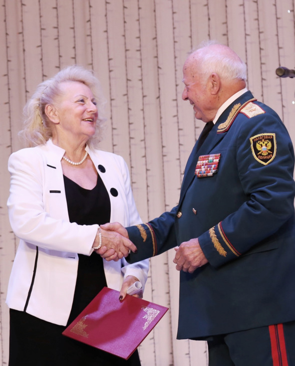 Председатель областного Совета ветеранов, почётный гражданин Челябинской области, генерал-лейтенант Анатолий Петрович Сурков торжественно вручил юбилейный поздравительный адрес председателю Совета ветеранов Кыштымского городского округа, почётному гражданину Кыштыма Нине Григорьевне Каданцевой