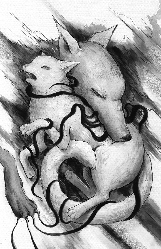 С того дня он обращался с кошкой лучше, чем с родными детьми, и почитал ее больше, чем собственных предков. Кошка жила в хозяйских покоях, ела самую вкусную рыбу и нежное мясо; ее ласкали и баловали, а собака жила во дворе и питалась объедками, размышляя о людской несправедливости. Она долго таила обиду. Однажды ночью она подстерегла кошку, когда та вышла на двор по нужде, яростно набросилась на бывшую подругу и перекусила ей хребет. С тех пор кошки и собаки, потомки этих двоих, друг друга ненавидят.