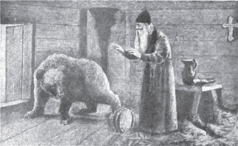 Святой Трифон, основатель Печенгского монастыря, и медведь, опрокидывающий квашню для теста