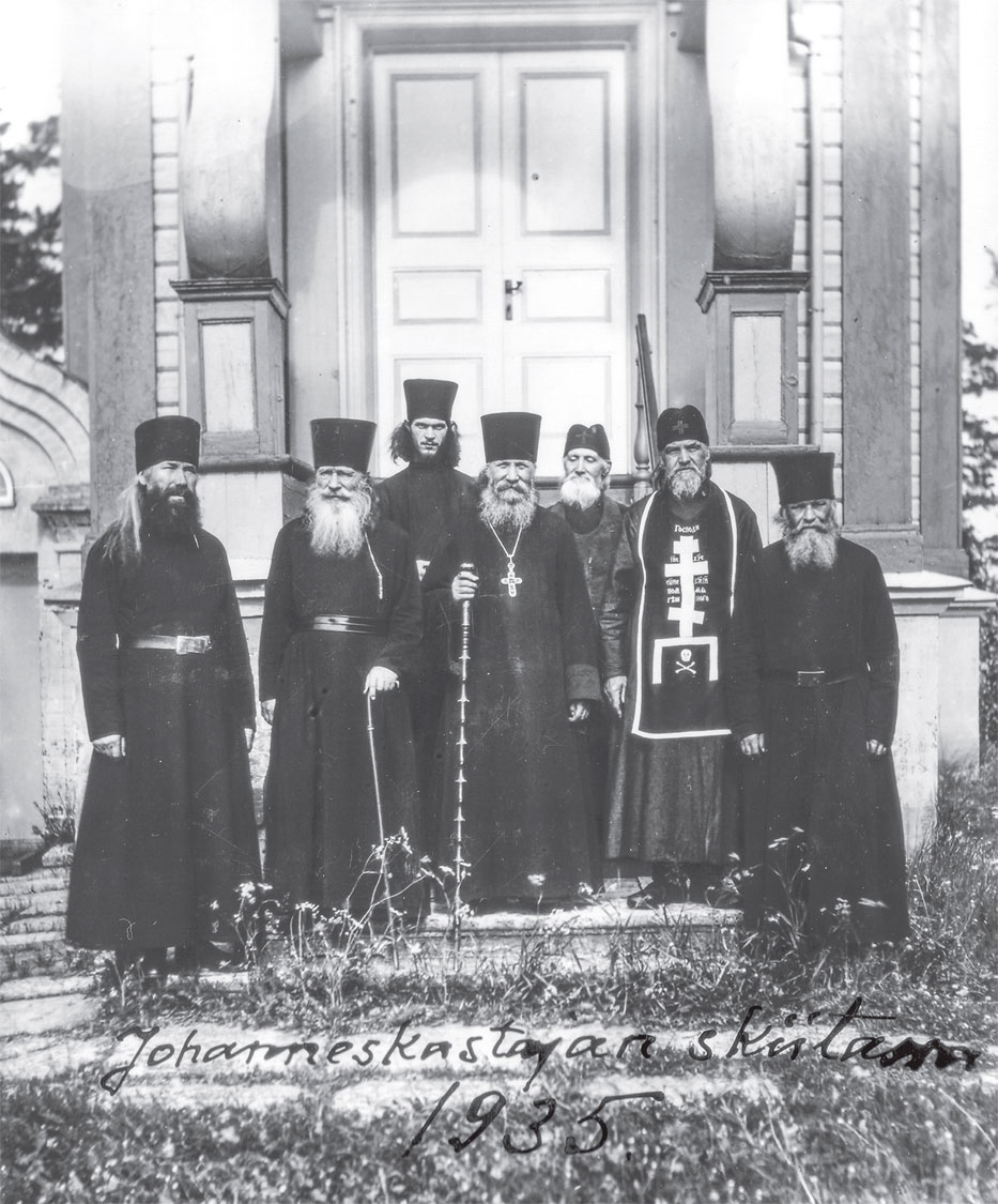 Иноки перед входом в скитскую церковь на острове святого Иоанна Предтечи. Слева направо: наместник иеромонах Исаакий, настоятель на покое архимандрит Павлин, келейник настоятеля рясофорный монах Марк (Шавыкин), настоятель игумен Харитон, схимонах Пионий, схиигумен Иоанн и водитель моторной лодки иеродиакон Рафаил