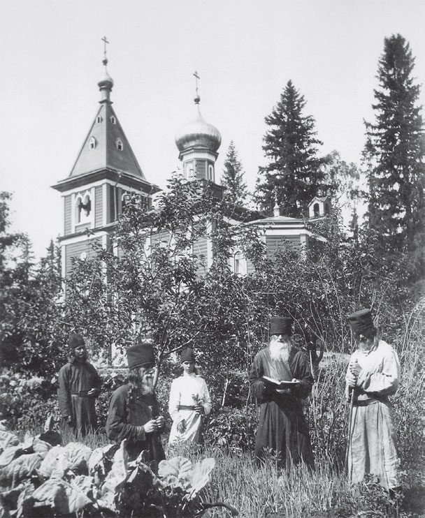 Монахи в саду Предтеченского скита