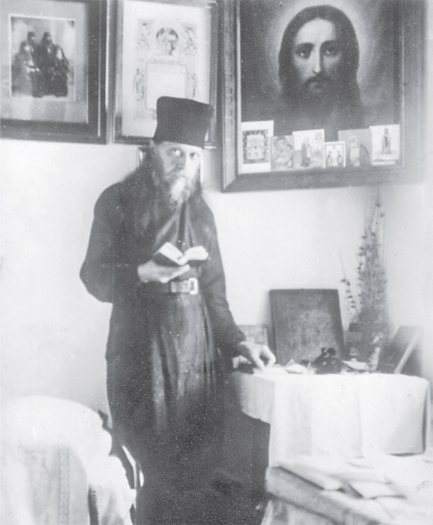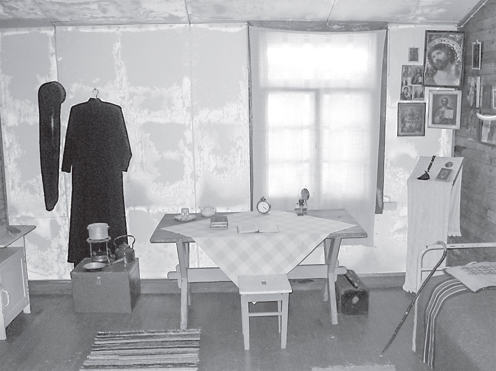 В комнате на вешалке висела длинная черная монашеская ряса. Зимой у кровати стояли огромные валенки. Они были необходимы в холодных, продуваемых сквозняком комнатах и для улицы. По размеру валенок можно было понять, что у старца были больные, опухшие ноги.