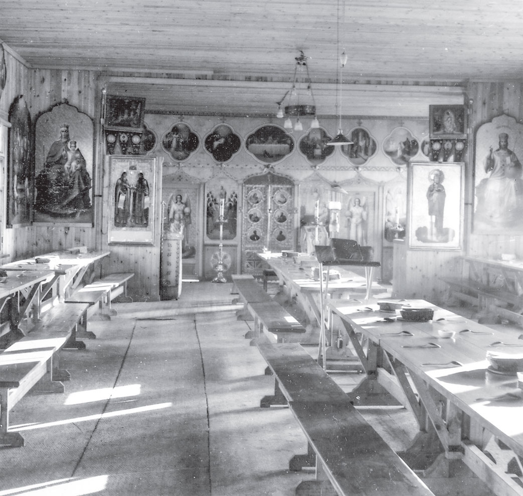 Скромная церковь Нового Валаама, в которой совершались ежедневные богослужения, – это единственное место в монастыре, где можно было собрать братию для каких-то официальных мероприятий. В высоком главном здании, стоявшем на выходящей к берегу стороне монастырского двора, жили игумен и некоторые братия. Здесь, в неотапливаемых чердачных помещениях, были устроены домовая церковь и ризница.