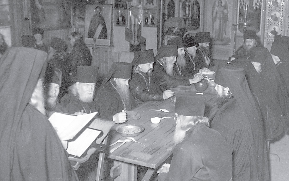 Братия за трапезой. Во главе стола игумен Нестор, второй по правую руку от него – схиигумен Иоанн