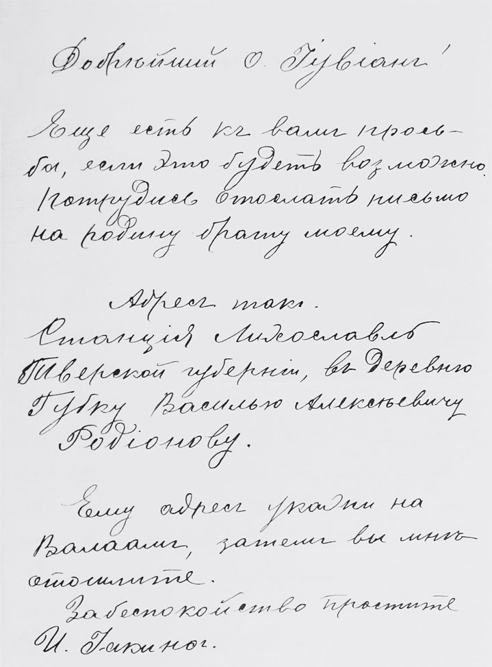 Отрывок из письма (автограф) игумена Печенгского монастыря Иакинфа, будущего старца Иоанна, отцу Иувиану