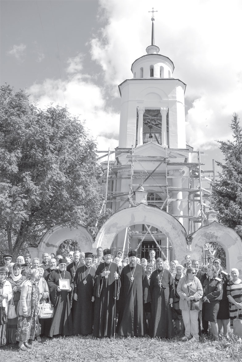 Прихожане и паломники из Финляндии у ворот Знаменской церкви с. Ильинского. Священнослужители в первом ряду (слева направо): протоиерей Сергий Коллиандер, епископ Арсений, митрополит Пантелеимон, епископ Филарет, протоиерей Серафим. Фото 11 июня 2014 г.