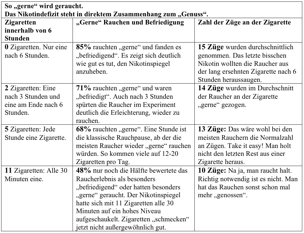Die Testraucher zeigen es ganz deutlich: Zigaretten werden am meisten „genossen“, je größer das Nikotindefizit wird. Der empfundene Genuss ist eine direkte Folge des abfallenden Nikotinspiegels. Sie werden zur Marionette des Nikotins. Das hat wenig zu tun mit dem selbst gewählten Genuss und Lebensstil, der uns in der Zigarettenwerbung vorgeführt wird.