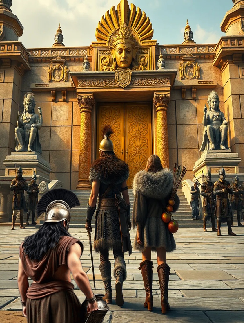Атлант отметил, что дворец Верховного уступает по размерам исполинскому дворцу повелителя его родины Зевеса, но по красоте и изяществу конструкции значительно превосходил все построенное атлантами. Перед дворцом высились сверкающие на солнце две фигуры наиболее почитаемых богов ариев – Вышеня и Крышеня, имеющие по три рубиновых глаза. Перед крепкими, распахнутыми настежь воротами, в два ряда выстроились ратники в одинаковой одежде с секирами в руках. Стоящие на зубчатой стене воины протрубили трижды в длинные трубы раджана, оповещая горожан, что визит высокого гостя начался.