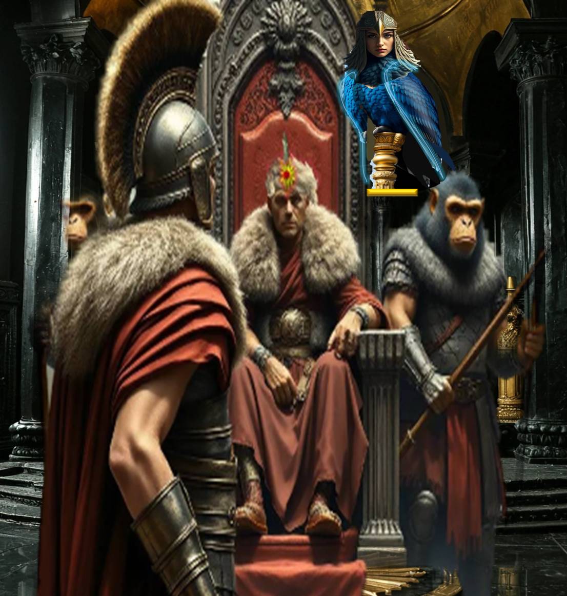 Процессия вошла в обширное помещение, и атлант увидел массивный золоченый трон, на спинке которого сидела громадная птица. Несмотря на то, что зал освещался изящными бронзовыми газовыми светильниками, было полутемно. Перед троном выстроились странные воины – гиганты с косматыми головами, похожими на обезьяньи, глубоко посаженные глазки которых колюче ощупывали гостей. У стен на длинных лавках в ожидании Совета сидело множество людей в богатых одеждах – военачальников и богатых купцов.